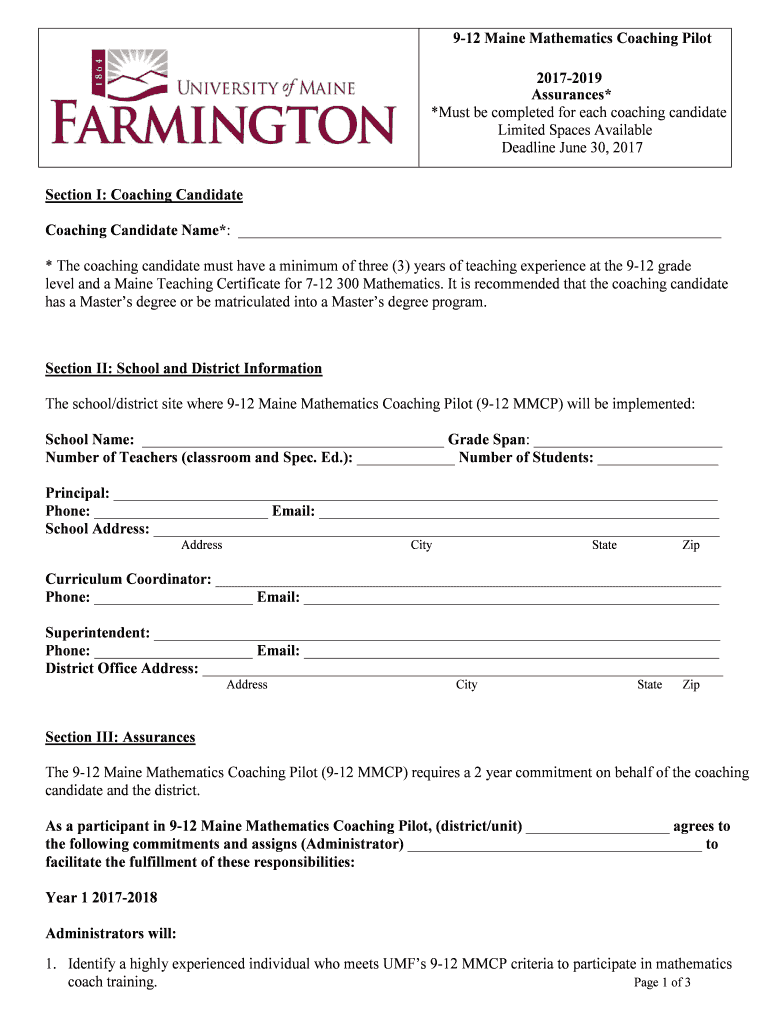 912 Maine Mathematics Coaching Pilot 220172019 Assurances* *Must be completed for each coaching candidate Limited Spaces Available Deadline June 30, 2017Section I: Coaching Candidate Name*: * The
