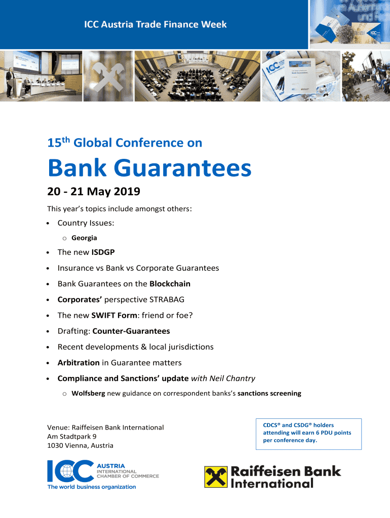 15th Global Conference bank Guarantees 20 21 May 2019 This year's topics include amongst others: Country Issues: o Georgia new ISDGPInsurance vs Bank vs Corporate GuaranteesBank Guarantees on the