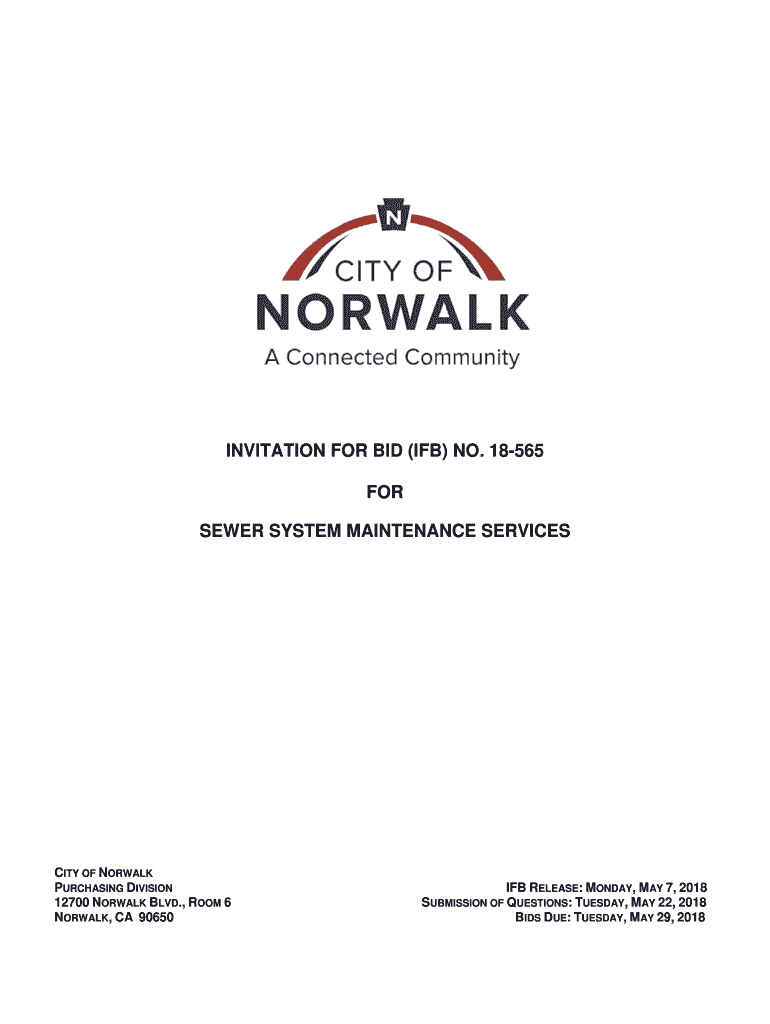 INVITATION FOR BID (IF) NO. 18565 FOR SEWER SYSTEM MAINTENANCE SERVICESCITY OF NORWALK PURCHASING DIVISION 12700 NORWALK BLVD., ROOM 6 NORWALK, CA 90650IFB RELEASE: MONDAY, MAY 7, 2018, SUBMISSION