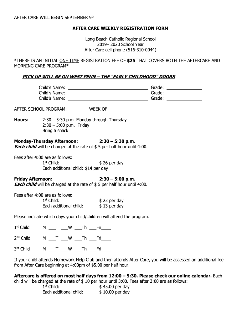 AFTER CARE WILL BEGIN SEPTEMBER 9th AFTER CARE WEEKLY REGISTRATION FORM Long Beach Catholic Regional School 2019 2020 School Year After Care cell phone (5163100044) *THERE IS AN INITIAL ONE TIME REGISTRATION