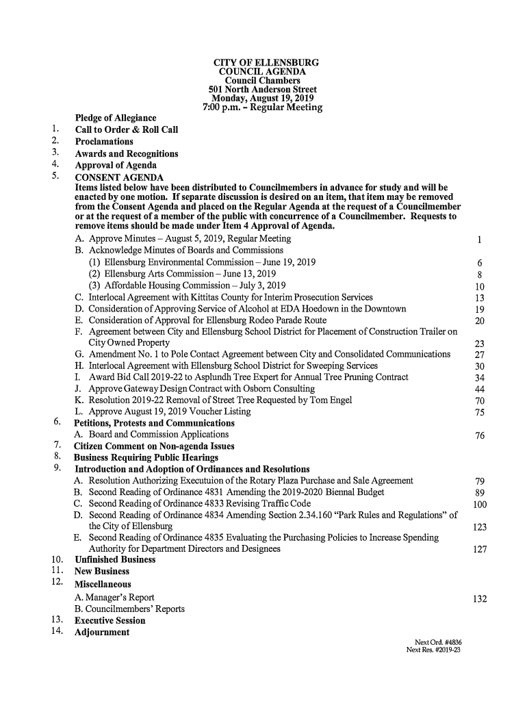 CITY OF ELLENSBURG COUNCIL AGENDA Council Chambers 501 North Anderson Street Monday, August 19, 2019 7:00 p.m. Regular Meeting1. 2. 3. 4. 5.6. 7. 8. 9.10. 11. 12. 13. 14. Pledge of Allegiance Call