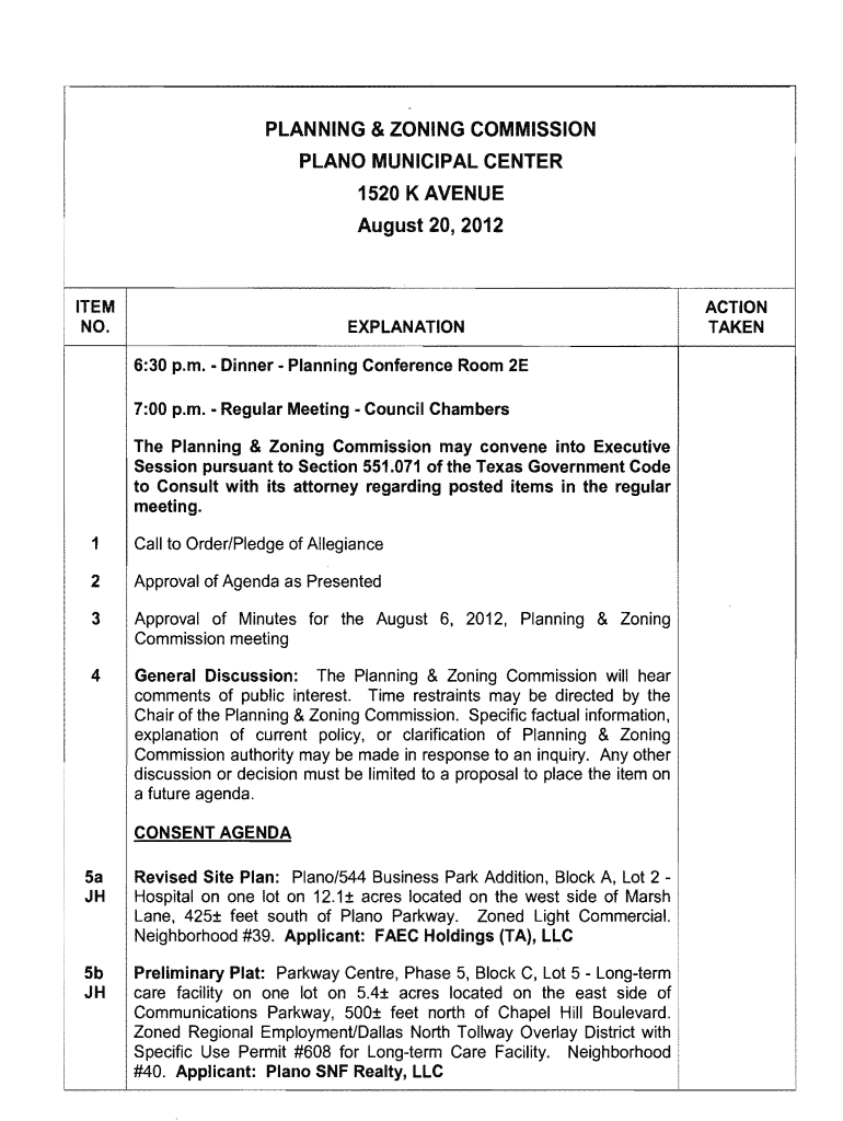 PLANNING & ZONING COMMISSIONPLANO MUNICIPAL CENTER 1520 AVENUE August 20, 2012ITEM NO.EXPLANATION 6:30 p.m. Dinner Planning Conference Room 2E 7:00 p.m. Regular Meeting Council Chambers The Planning