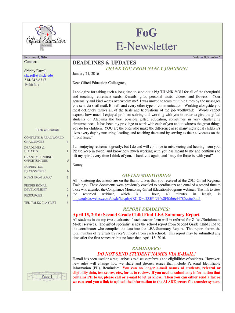 Fog Newsletter February 4, 2016Volume 8, Number 7Contact:DEADLINES & UPDATES THANK YOU FROM NANCY JOHNSON! Shirley Farrell alone.edu 3342428317 shirfarrJanuary 21, 2016 Dear Gifted Education Colleagues,