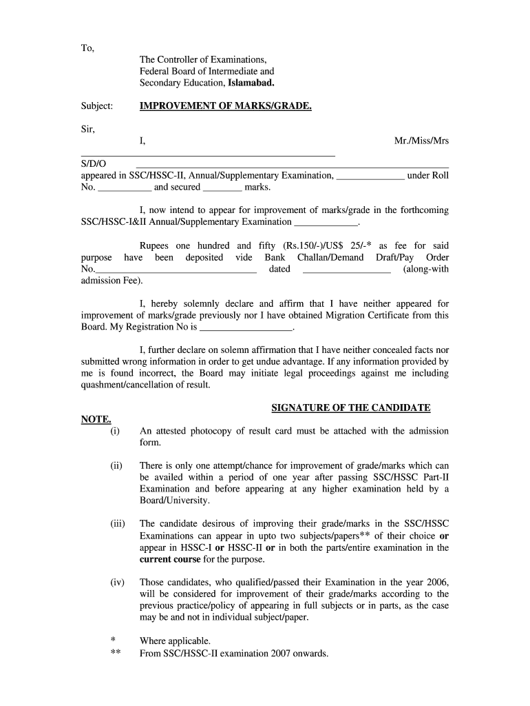 To, The Controller of Examinations, Federal Board of Intermediate and Secondary Education, Islamabad. Subject:IMPROVEMENT OF MARKS/GRADE. Sir, I, Mr./Miss/Mrs S/D/O appeared in SSC/HSS CII, Annual/Supplementary