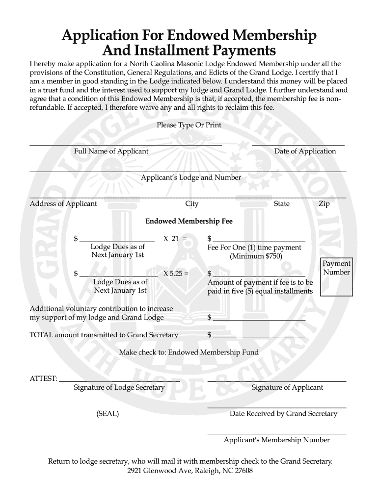 And Installment Payments hereby make application for a North Carolina Masonic Lodge Endowed Membership under all the