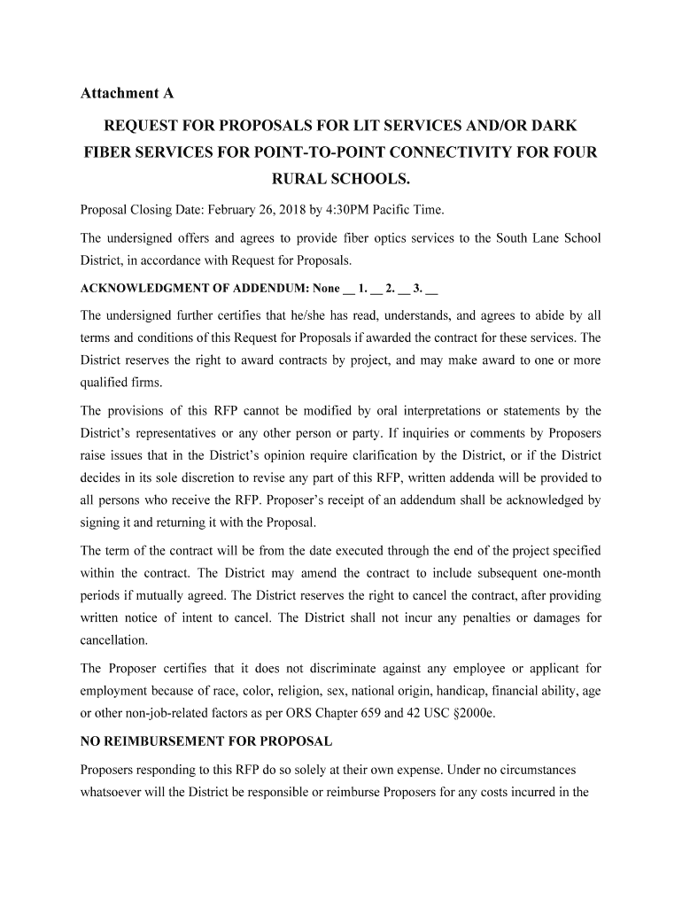 Attachment A REQUEST FOR PROPOSALS FOR LIT SERVICES AND/OR DARK FIBER SERVICES FOR POINTTOPOINT CONNECTIVITY FOR FOUR RURAL SCHOOLS. Proposal Closing Date: February 26, 2018, by 4:30PM Pacific Time.
