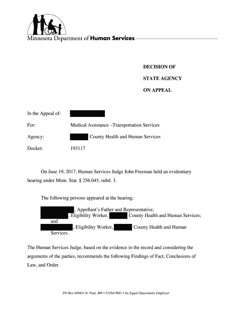 DECISION OF STATE AGENCY ON Appealing the Appeal of: For:Medical Assistance Transportation ServicesAgency:County Health and Human ServicesDocket:193117On June 19, 2017, Human Services Judge John Freeman