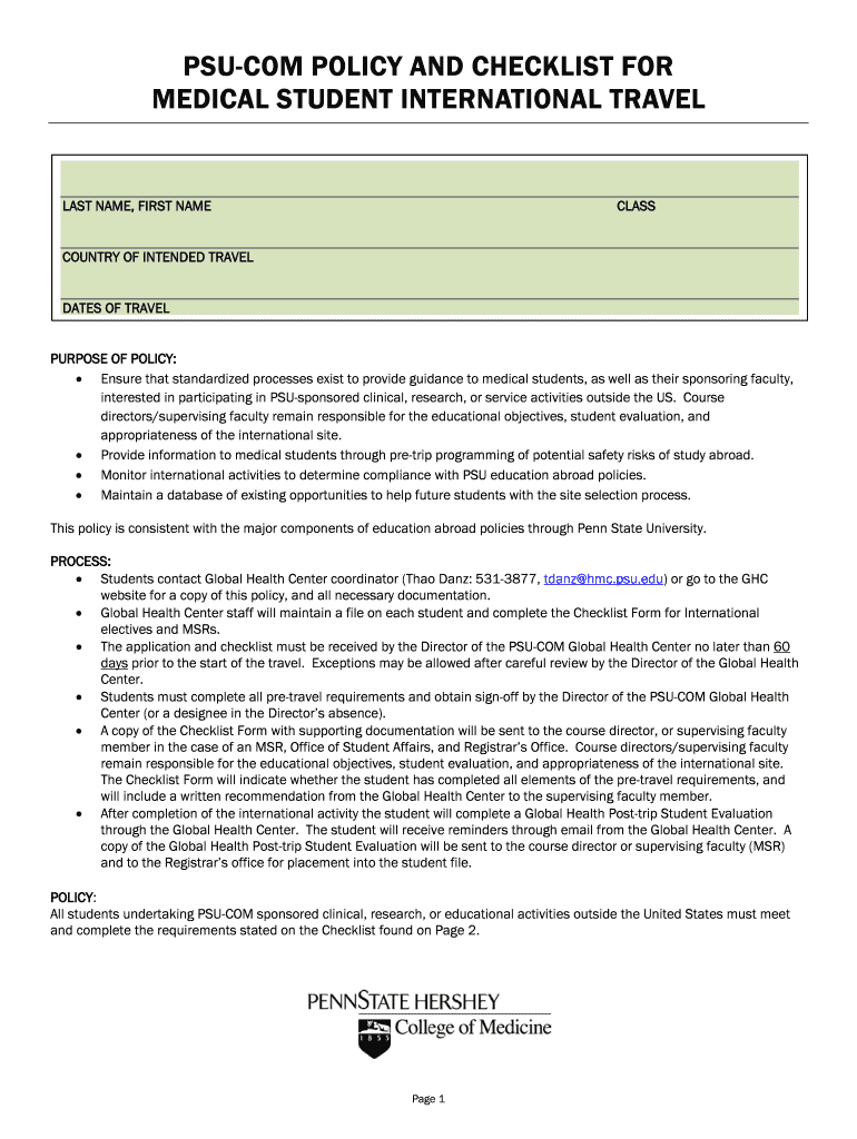 PSU COM POLICY AND CHECKLIST FOR MEDICAL STUDENT INTERNATIONAL TRAVELS NAME, FIRST NAMECLASSCOUNTRY OF INTENDED TRAVEL DATES OF TRAVEL PURPOSE OF POLICY: Ensure that standardized processes exist to