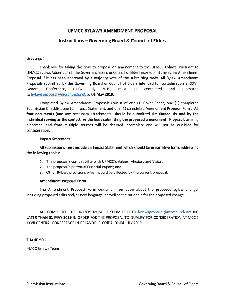 FCC BYLAWS AMENDMENT PROPOSAL Instructions Governing Board & Council of Elders Greetings! Thank you for taking the time to propose an amendment to the FCC Bylaws. Pursuant to FCC Bylaws Addendum 1,