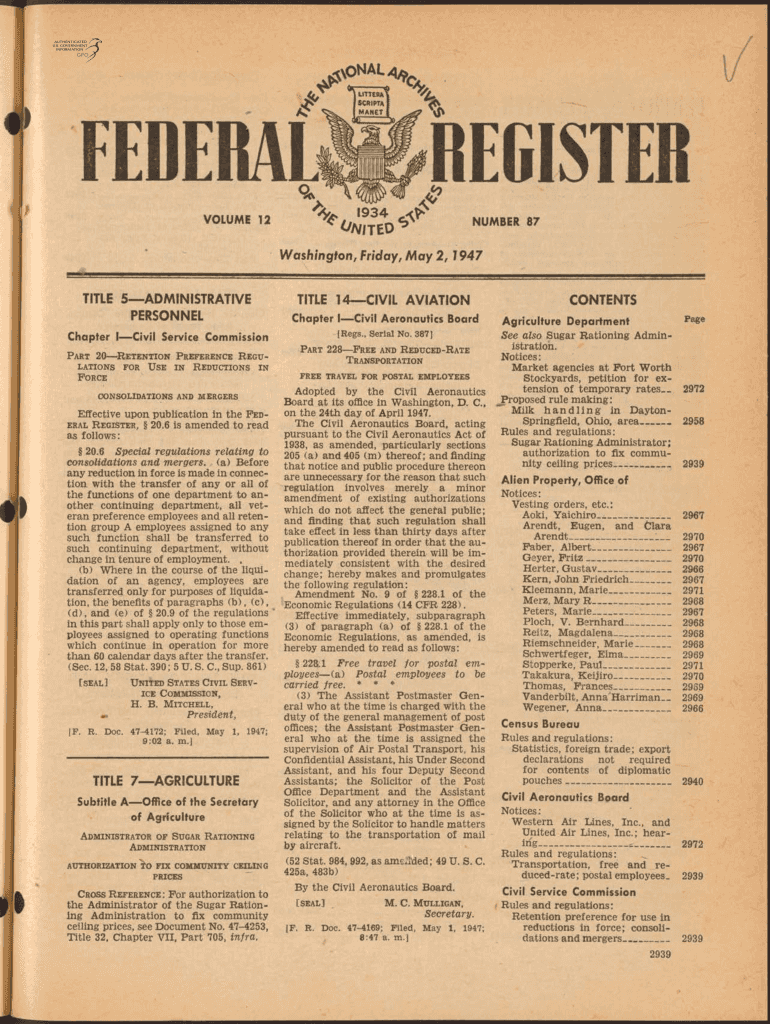 6/Federalist ITT SCRIPT ! I UAU CT in. tKjvREGISTERVOLUME 12NUMBER 87Washington, Friday, May 2,1 947TITLE 5 ADMINISTRATIVE PERSONNELChapter I Civil Aeronautics BoardChapter I Civil Service Commissioners.,