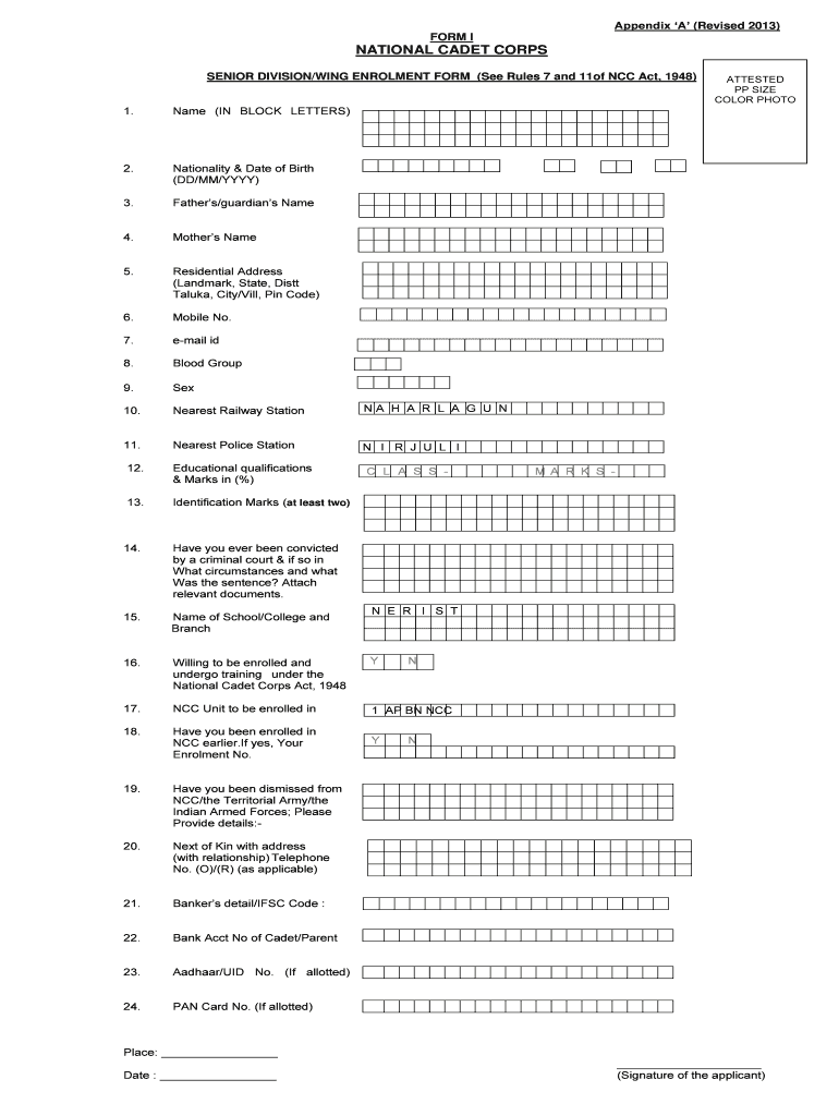 Get the free FORM I NATIONAL CADET CORPS. SENIOR DIVISION/WING ... - nerist ac
