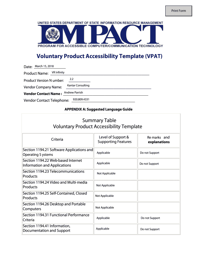 Print FormVoluntary Product Accessibility Template (PAT) March 15, 2018, Date: VR Infinity Product Name: Product Version N umber: Vendor Company Name:2.2 Kan tar Consulting Andrew Parrish Vendor Contact