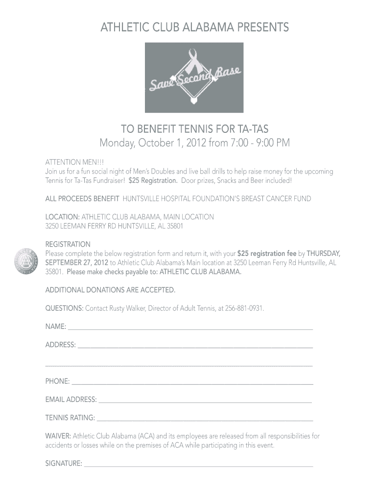 ATHLETIC CLUB ALABAMA PRESENT STO BENEFIT TENNIS FOR TATAR Monday, October 1, 2012, from 7:00 9:00 PM ATTENTION MEN!!! Join us for a fun social night of Men Doubles and live ball drills to help raise