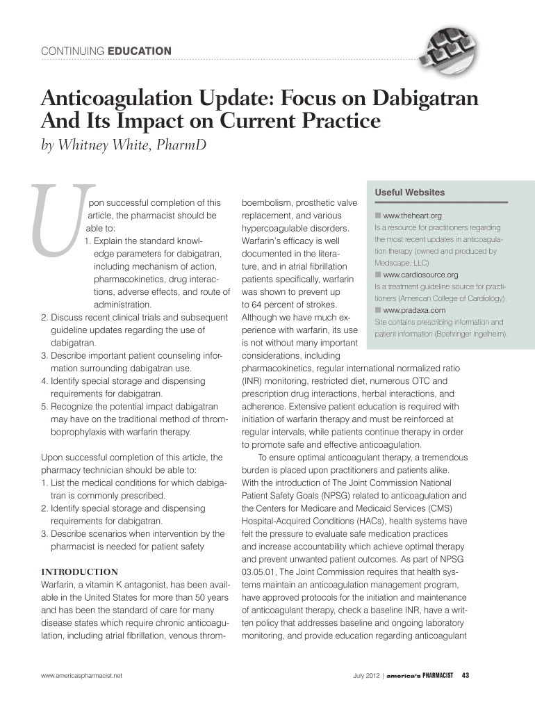 Continuing educationAnticoagulation Update: Focus on Dabigatran