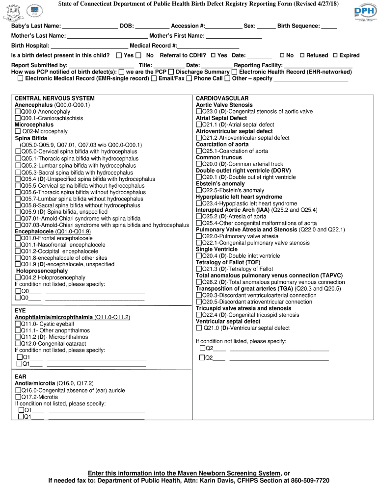 State of Connecticut Department of Public Health Birth Defect Registry Reporting Form (Revised 4/27/18)Babies Last Name: DOB: Accession #: Sex: Birth Sequence: Mothers Last Name: Mothers First Name: