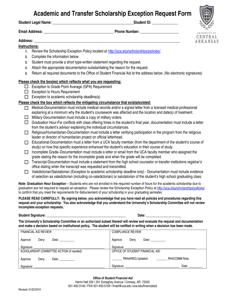 Academic and Transfer Scholarship Exception Request Form Student Legal Name: Student ID: Email Address: Phone Number: Address: Instructions: 1. Review the Scholarship Exception Policy located at http://uca.edu/scholarships/policies/.