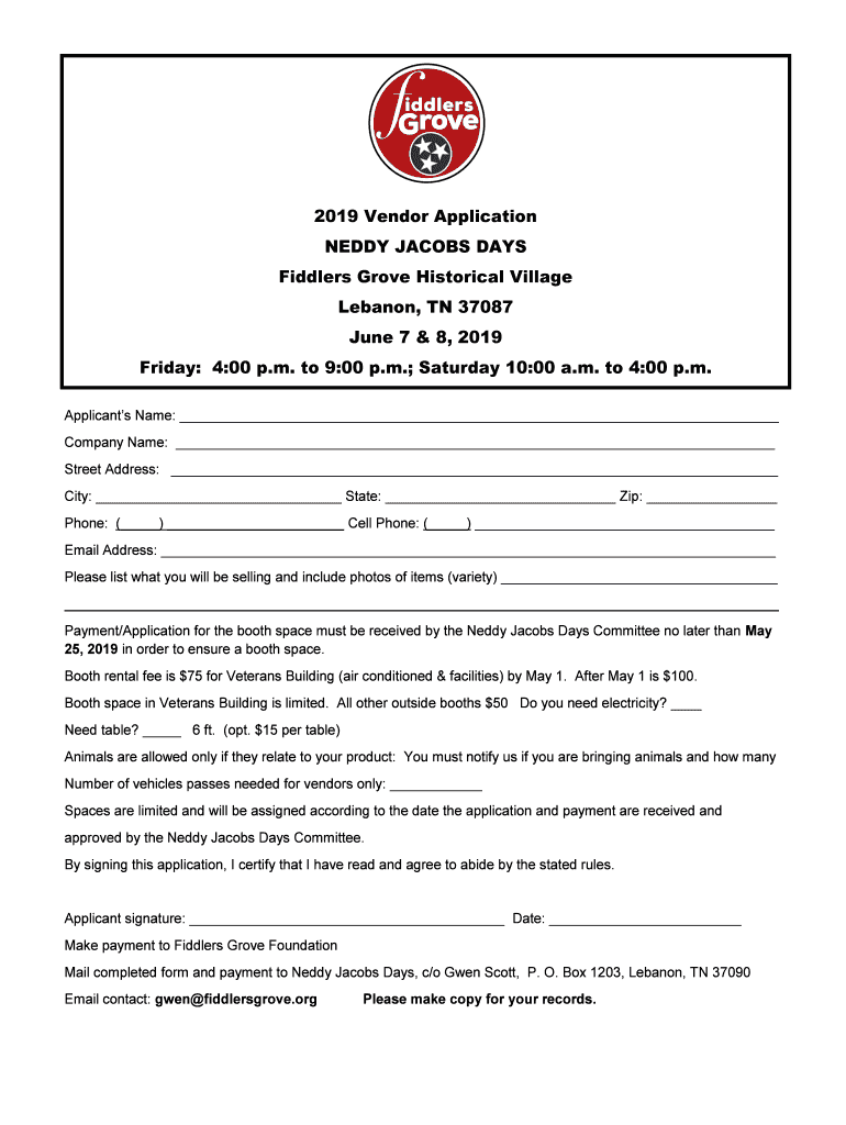 2019 Vendor Application TEDDY JACOBS DAYS Fiddlers Grove Historical Village Lebanon, TN 37087 June 7 & 8, 2019 Friday: 4:00 p.m. to 9:00 p.m.; Saturday 10:00 a.m. to 4:00 p.m. Applicants Name: Company