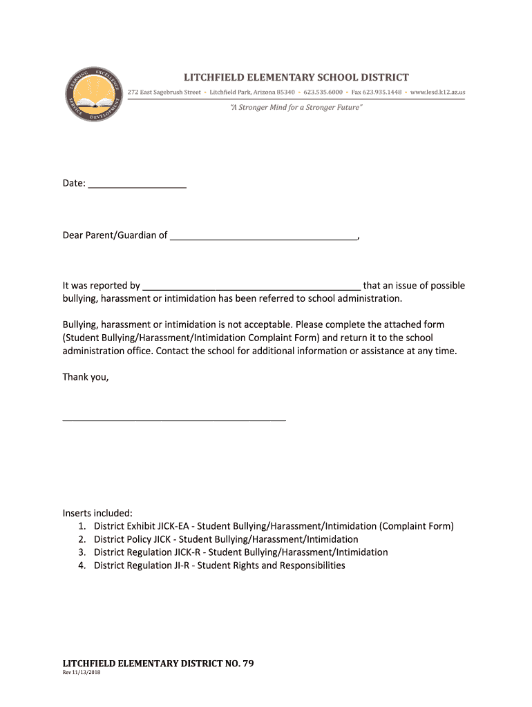Date: Dear Parent/Guardian of, It was reported by that an issue of possible bullying, harassment or intimidation has been referred to school administration. Bullying, harassment or intimidation is