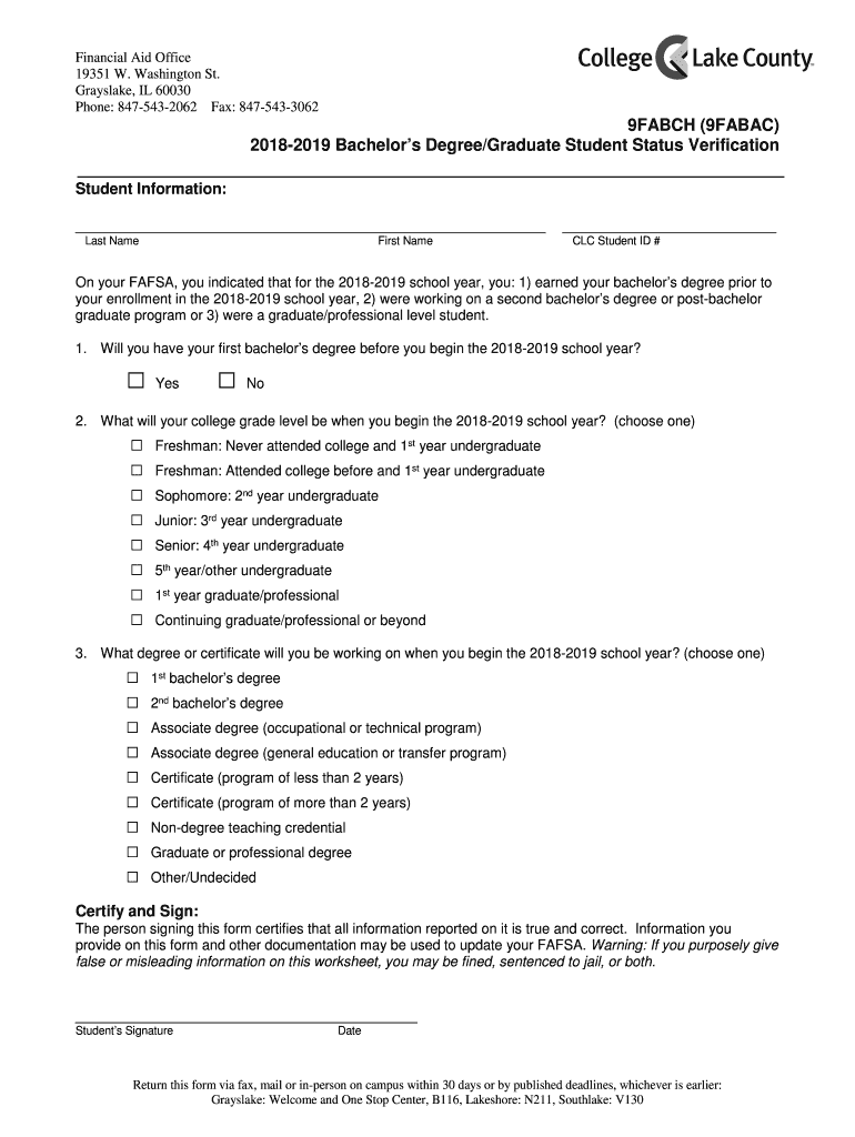 Financial Aid Office 19351 W. Washington St. Grayslake, IL 60030 Phone: 8475432062 Fax: 84754330629FABCH (9FABAC) 20182019 Bachelors Degree/Graduate Student Status Verification Student Information: