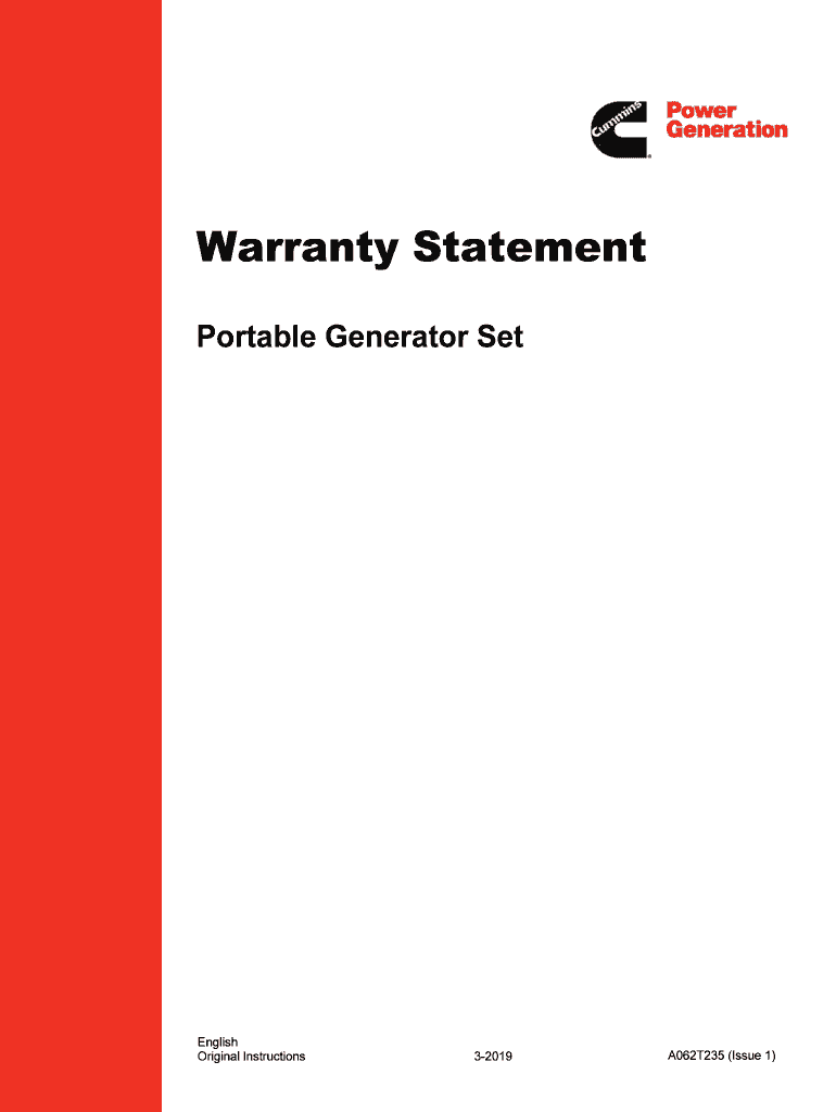 Warranty Statement Portable Generator Set English Original Instructions32019A062T235 (Issue 1)Limited WarrantyCummins Inc. Responsibilities:Portable Generator Stein the event of a failure of the Product