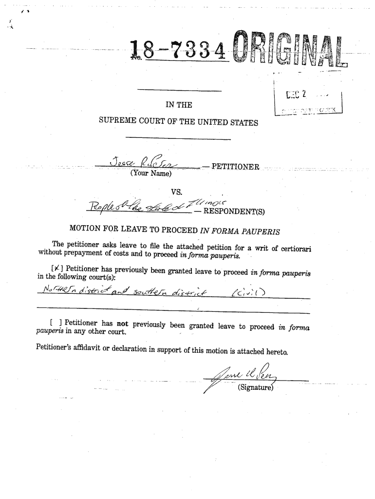 4.IN THE SUPREME COURT OF THE UNITED STATES(your Name).PETITIONER. w ...VS. RESPONDENT(S) 'MOTION FOR LEAVE TO PROCEED IN FORM PAUPERS The petitioner asks leave to file the attached petition for a