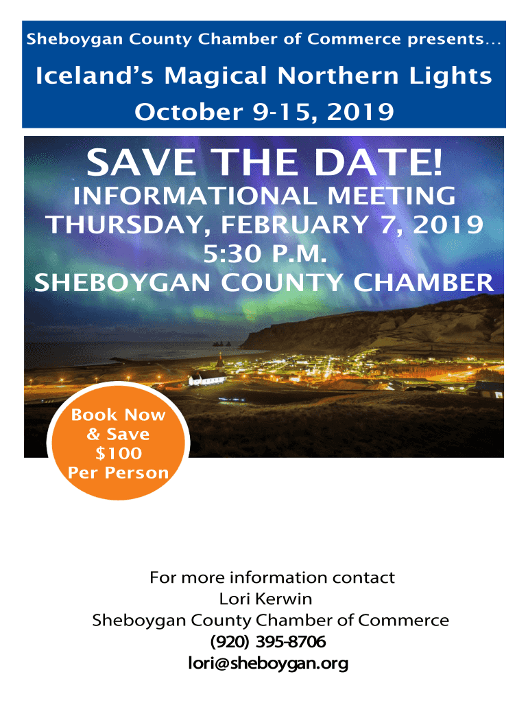 Sheboygan County Chamber of Commerce presentsIcelands Magical Northern Lights October 915, 2019SAVE THE DATE!INFORMATIONAL MEETING THURSDAY, FEBRUARY 7, 2019 5:30 P.M. SHEBOYGAN COUNTY Chamberlain