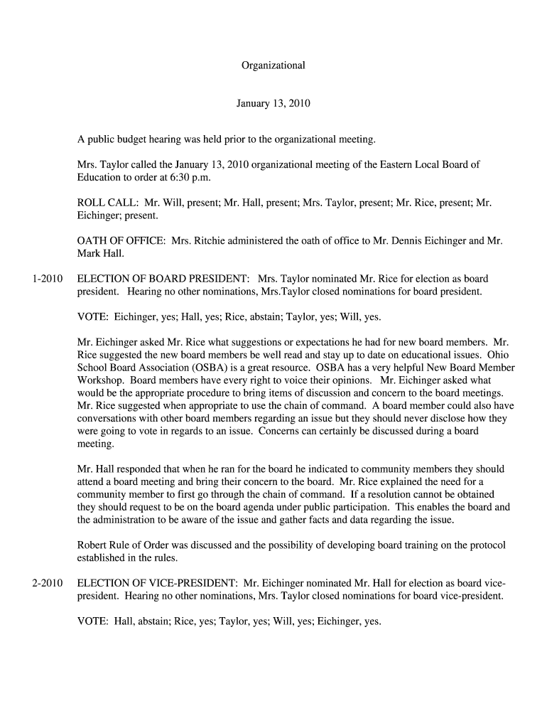 Mrs. Taylor called the January 13, 2010, organizational meeting of the Eastern Local Board of