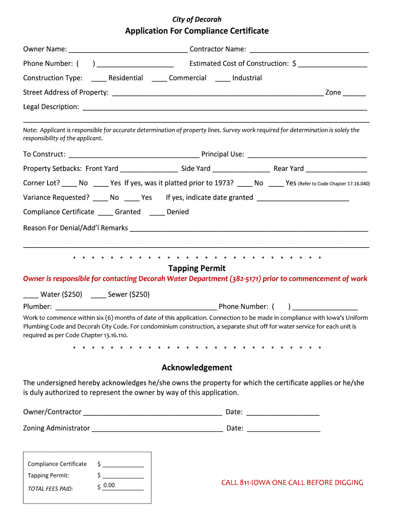City of DecorahApplication For Compliance Certificate Owner Name: Contractor Name: Phone Number: () Construction Type: ResidentialEstimated Cost of Construction: $ Commercial IndustrialStreet Address