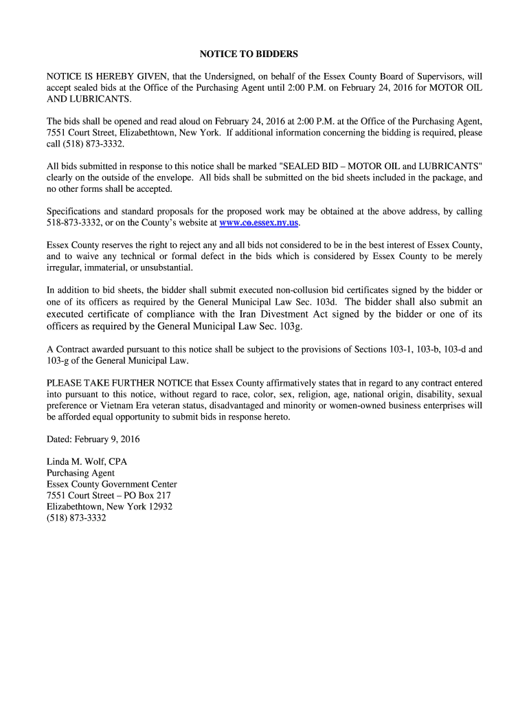 NOTICE IS HEREBY GIVEN, that the Undersigned, on behalf of the Essex County Board of Supervisors, will