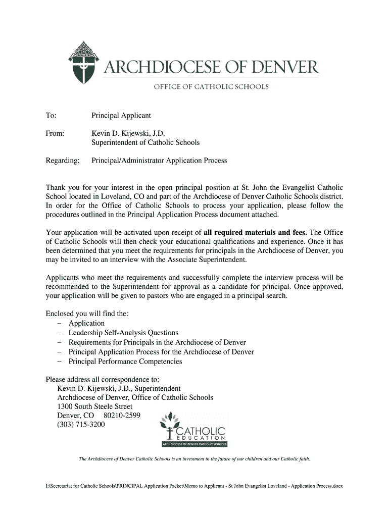 Superintendent of Catholic SchoolsRegarding:Principal/Administrator Application ProcessThank you for your interest in the open principal position
