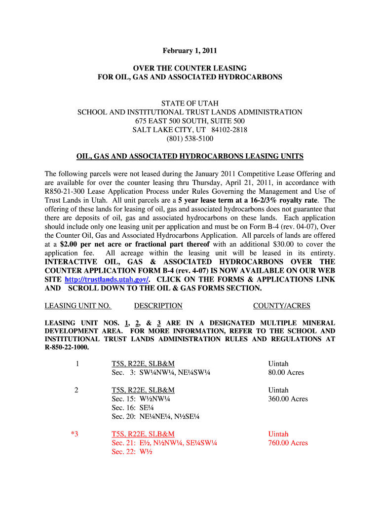 Get the free February 1, 2011 OVER THE COUNTER LEASING FOR OIL, GAS AND ... - trustlands utah