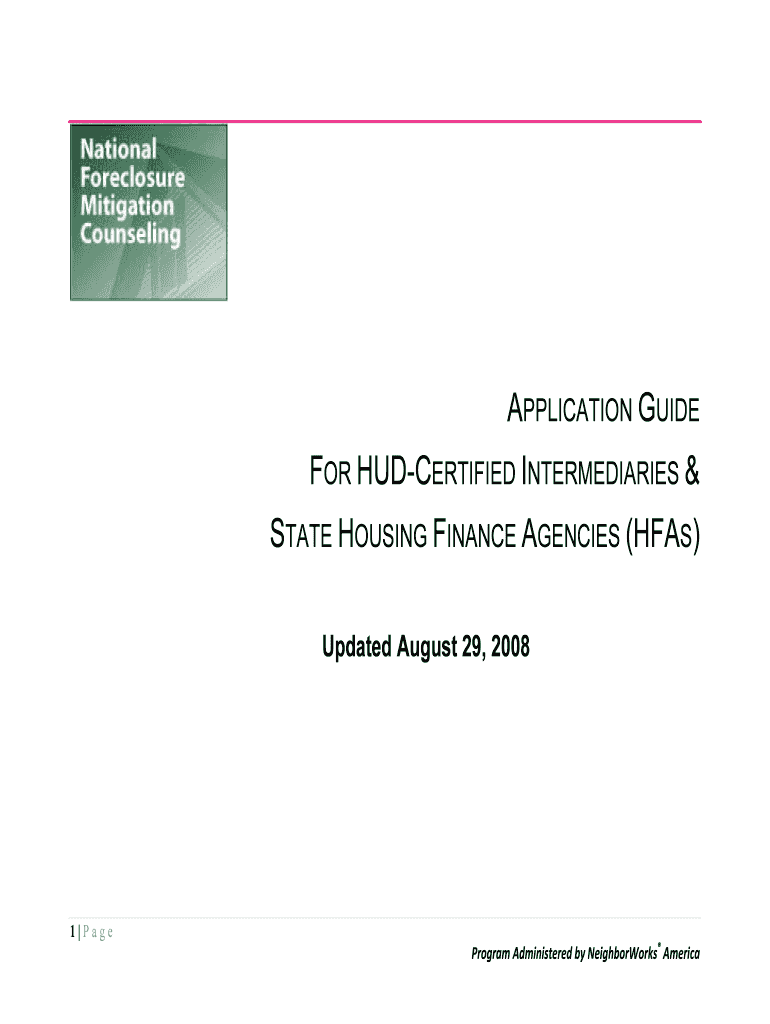 !!! APPLICATION GUIDE FOR UNCERTIFIED INTERMEDIARIES & STATE HOUSING FINANCE AGENCIES (HAS) Updated August 29, 20081-Page Program! Administered!by! NeighborWorks4! America!TABLE OF CONTENTS How to