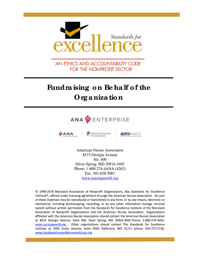 Fundraising on Behalf of the Organization American Nurses Association 8515 Georgia Avenue Ste. 400 Silver Spring, MD 209103492 Phone: 18002744ANA (4262) Fax: 3016285001 www.nursingworld.org 19982019