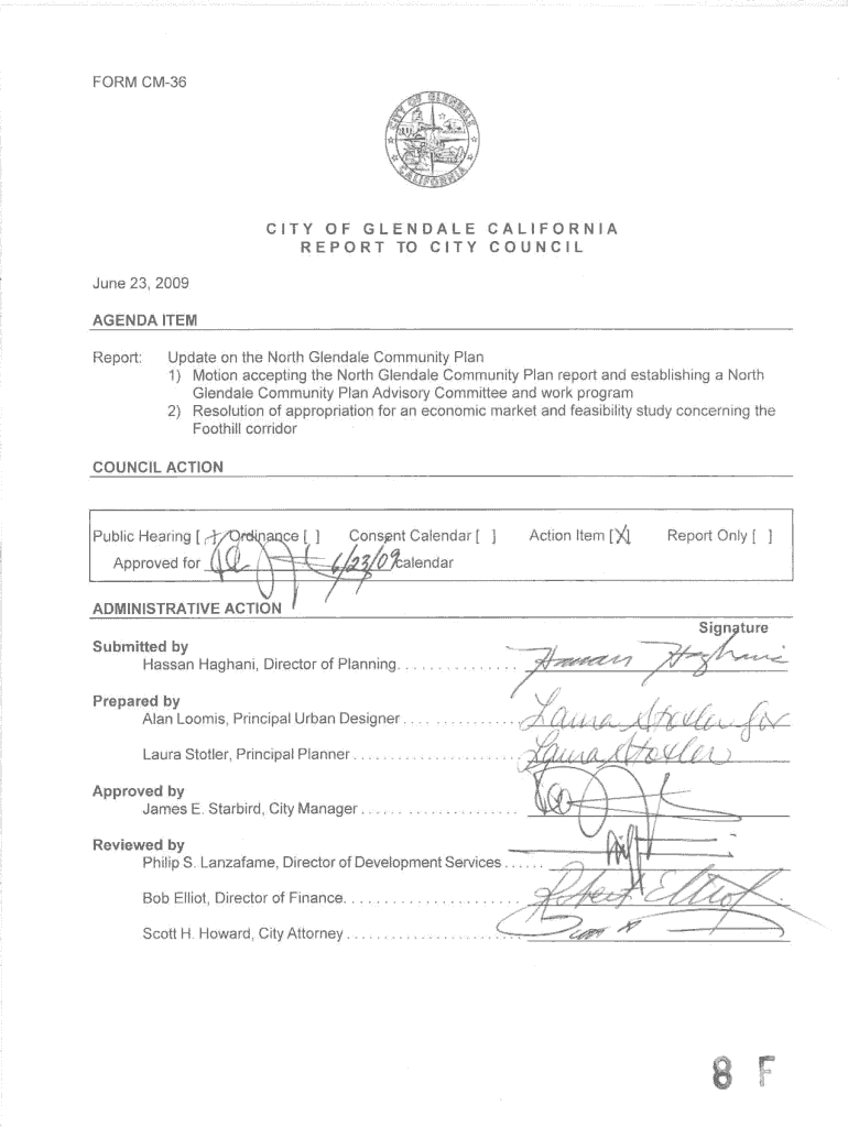 FORM CM36CIT Y OF GLENDALE CALIFORNIA REPORT TO CIT Y COUNCIL June 23, 2009AGENDA ITEM Report:Update on the North Glendale Community Plan 1) Motion accepting the North Glendale Community Plan report