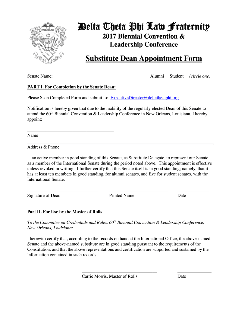 Delta Theta Phi Law Fraternity 2017 Biennial Convention & Leadership ConferenceSubstitute Dean Appointment Form Senate Name: AlumniStudent(circle one)PART I. For Completion by the Senate Dean: Please