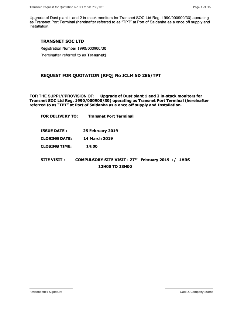 Transnet Request for Quotation No ICBM SD 286/TPT Page 1 of 36Upgrade of Dust plant 1 and 2 in stack monitors for Transnet SOC Ltd Reg. 1990/000900/30) operating as Transnet Port Terminal (hereinafter