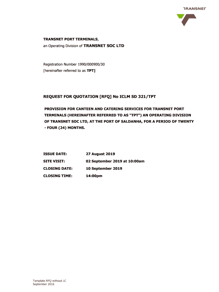 TRANSFER PORT TERMINALS, an Operating Division of TRANSFER SOC Registration Number 1990/000900/30 hereinafter referred to as TPT REQUEST FOR QUOTATION RFQ No ICBM SD 321/TPT PROVISION FOR CANTEEN