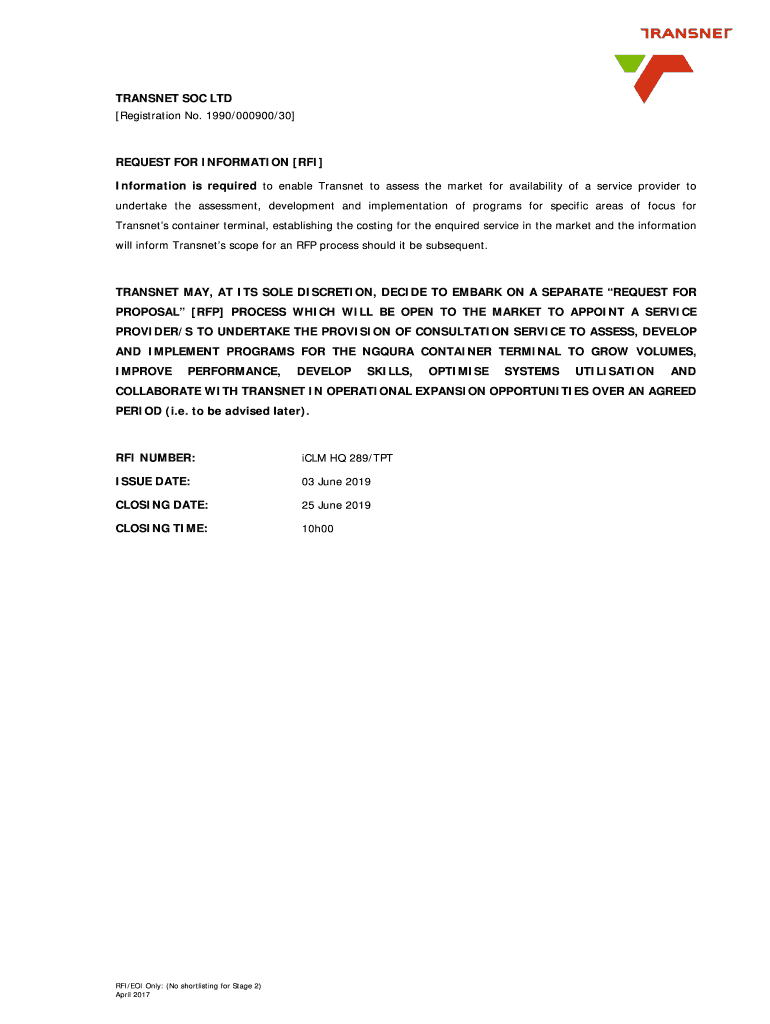 TRANSFER SOC LTD Registration No. 1990/000900/30 REQUEST FOR INFORMATION RFI Information is required to enable Transnet to assess the market for availability of a service provider to undertake the