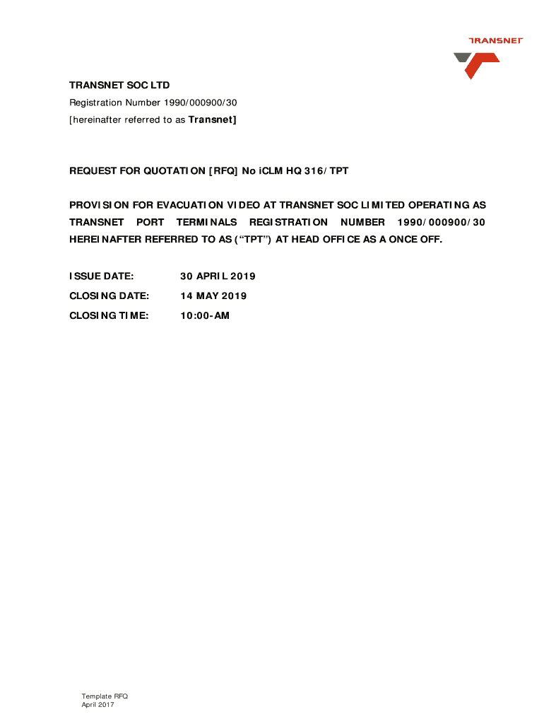 TRANSFER SOC LTD Registration Number 1990/000900/30 hereinafter referred to as Transnet REQUEST FOR QUOTATION RFQ No ICBM HQ 316/TPT PROVISION FOR EVACUATION VIDEO AT TRANSFER SOC LIMITED OPERATING