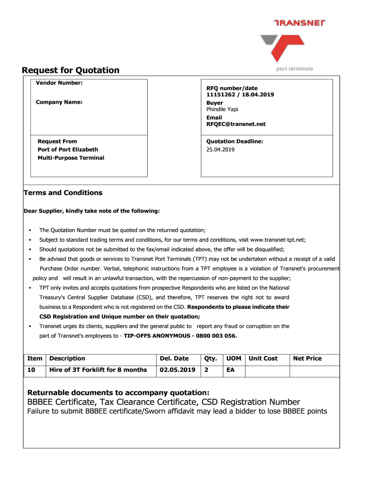 Request for Quotation Vendor Number:RFQ number/date 11151262 / 18.04.2019Company Name:Buyer Principle Yap Email REC transnet. Request FromQuotation Deadline:Port of Port Elizabeth25.04.2019MultiPurpose