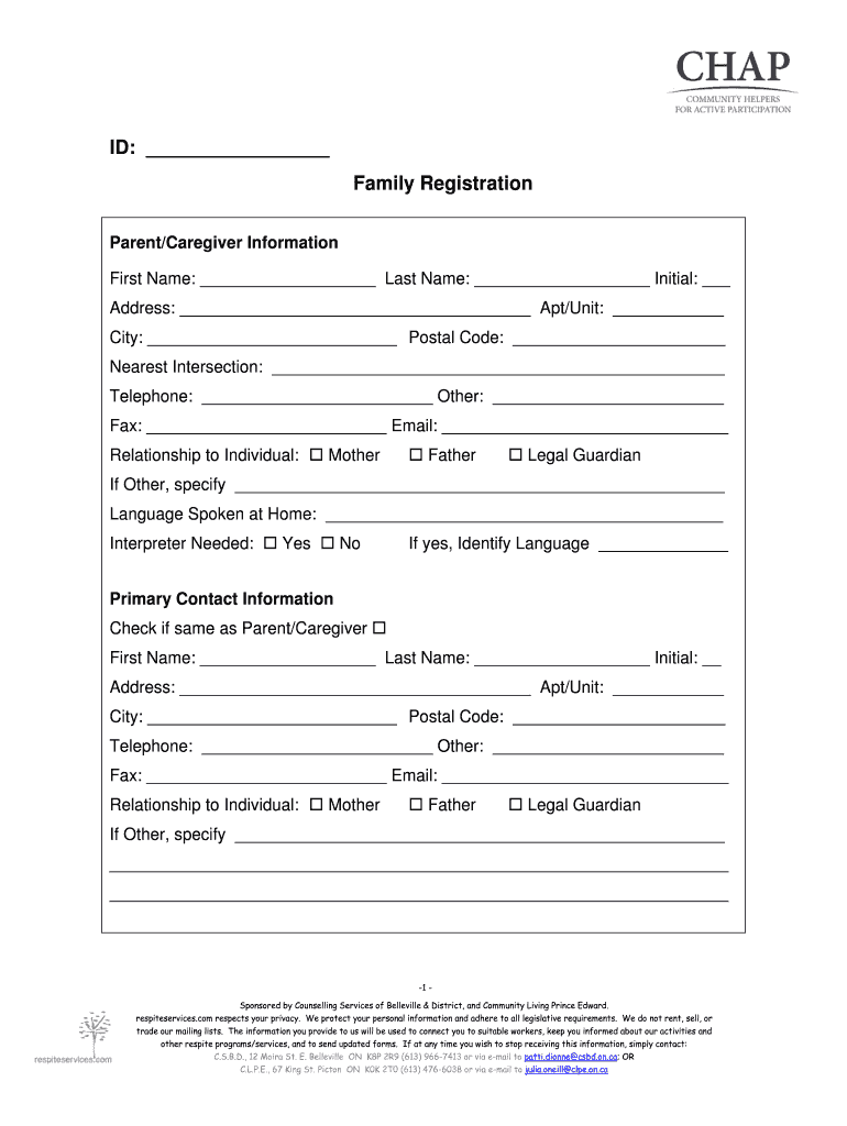 ID: Family Registration Parent/Caregiver Information First Name: Last Name: Initial: Address: Apt/Unit: City: Postal Code: Nearest Intersection: Telephone: Other: Fax: Email: Relationship to Individual:
