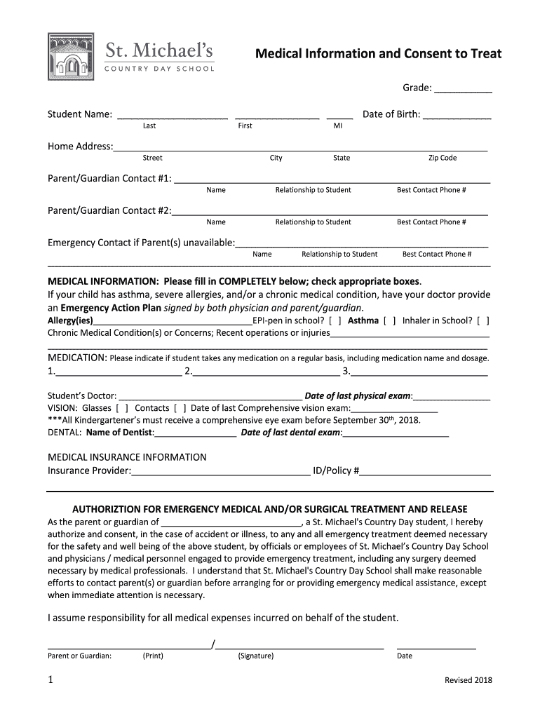 Medical Information and Consent to Treat Grade: Student Name: Date of Birth: LastFirstMIHome Address: StreetCityStateZip Godparent/Guardian Contact #1: NameRelationship to Student Best Contact Phone