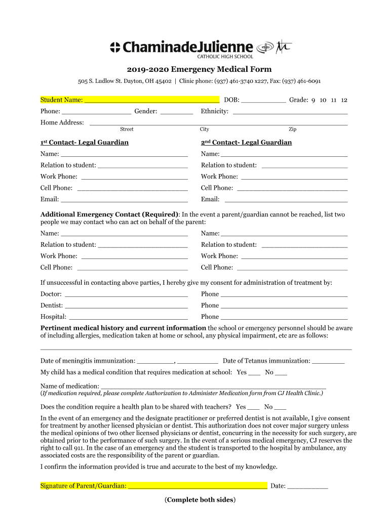 20192020 Emergency Medical Form 505 S. Ludo St. Dayton, OH 45402 Clinic phone: (937) 4613740 x227, Fax: (937) 4616091Student Name: DOB: Grade: 9 10 11 12 Phone: Gender: Ethnicity: Home Address: StreetCityZip1st