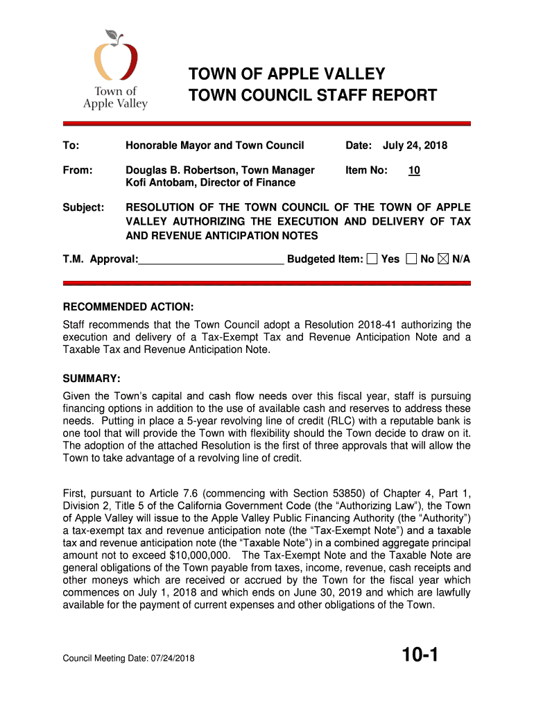 TOWN OF APPLE VALLEY TOWN COUNCIL STAFF REPORT To:Honorable Mayor and Town Conciliate:From:Douglas B. Robertson, Town Manager KOF Antonym, Director of Financier No:Subject:RESOLUTION OF THE TOWN COUNCIL