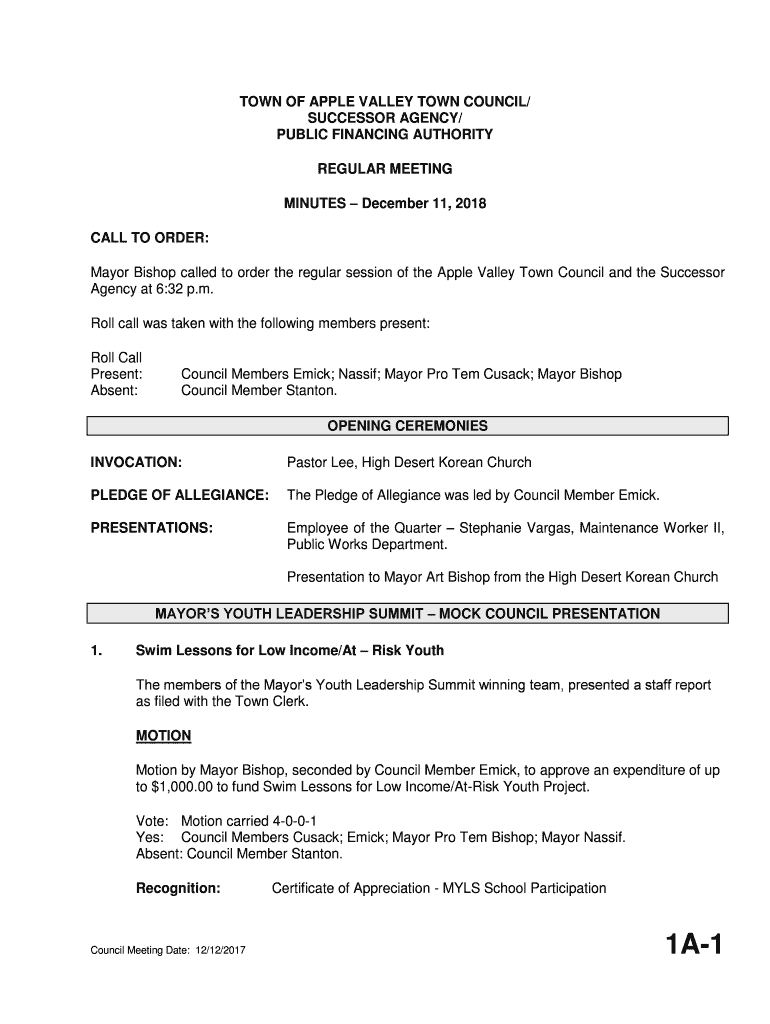TOWN OF APPLE VALLEY TOWN COUNCIL/ SUCCESSOR AGENCY/ PUBLIC FINANCING AUTHORITY REGULAR MEETING MINUTES December 11, 2018, CALL TO ORDER: Mayor Bishop called to order the regular session of the Apple