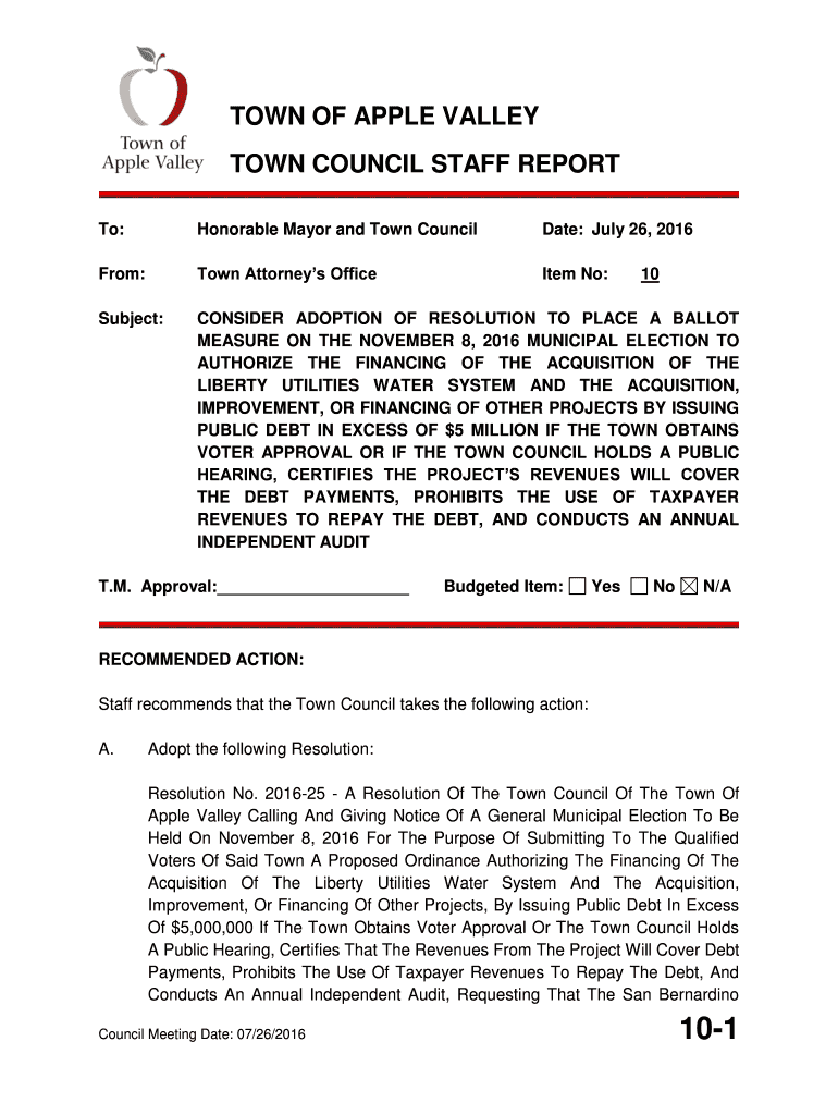 To:Honorable Mayor and Town Conciliate: July 26, 2016From:Town Attorneys Officiated No:Subject:CONSIDER ADOPTION OF RESOLUTION TO PLACE A BALLOT