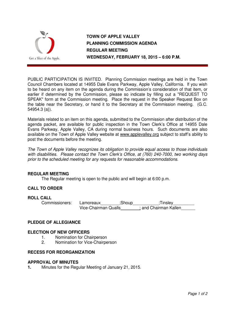 TOWN OF APPLE VALLEY PLANNING COMMISSION AGENDA REGULAR MEETING WEDNESDAY, FEBRUARY 18, 2015 6:00 P.M.PUBLIC PARTICIPATION IS INVITED. Planning Commission meetings are held in the Town Council Chambers