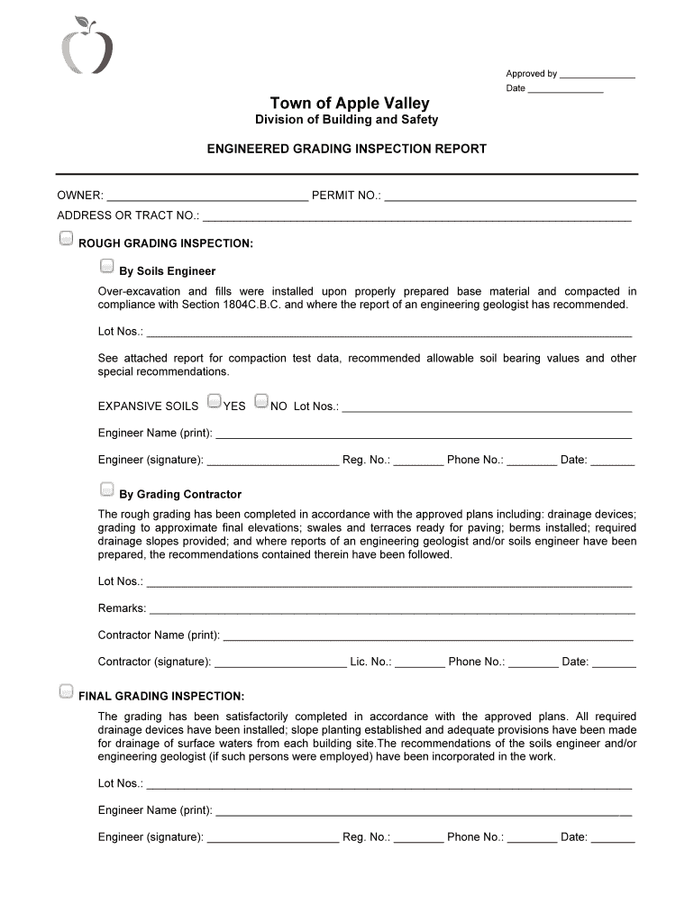 Approved by Date Town of Apple Valley Division of Building and Safety ENGINEERED GRADING INSPECTION REPORTER: PERMIT NO.: ADDRESS OR TRACT NO.: ROUGH GRADING INSPECTION: By Soils Engineer Over excavation