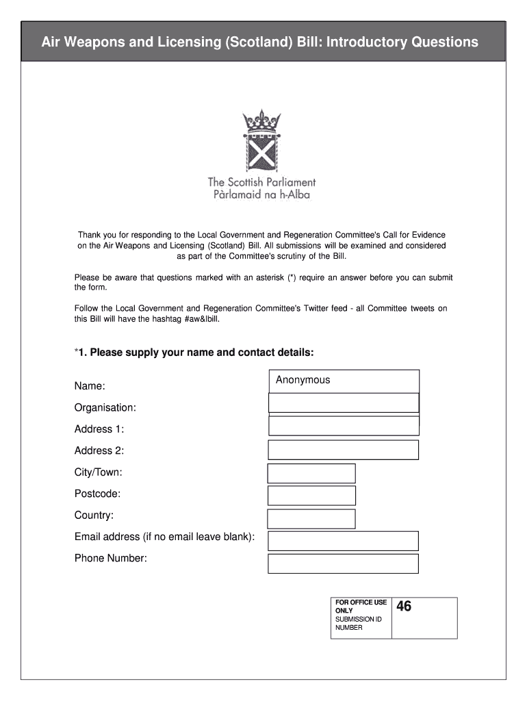 Air Weapons and Licensing (Scotland) Bill: Introductory QuestionsThank you for responding to the Local Government and Regeneration Committee's Call for Evidence on the Air Weapons and Licensing (Scotland)