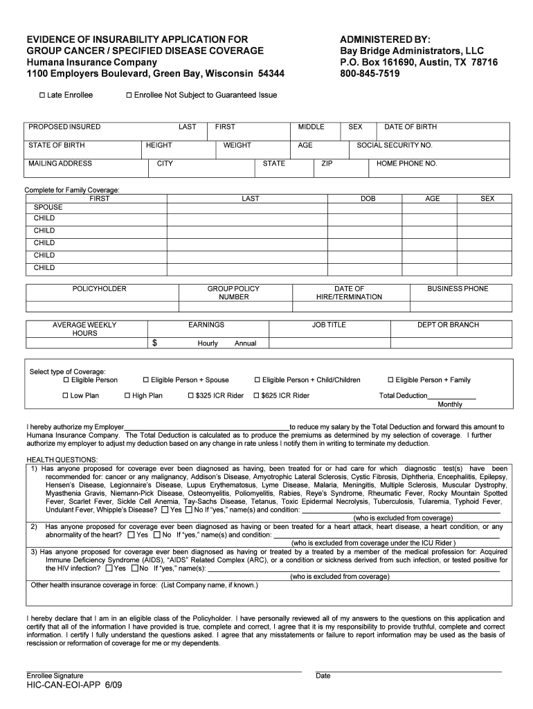 EVIDENCE OF INSURABILITY APPLICATION FOR GROUP CANCER / SPECIFIED DISEASE COVERAGE Human Insurance Company 1100 Employers Boulevard, Green Bay, Wisconsin 54344 Late EnrolleeADMINISTERED BY: Bay Bridge
